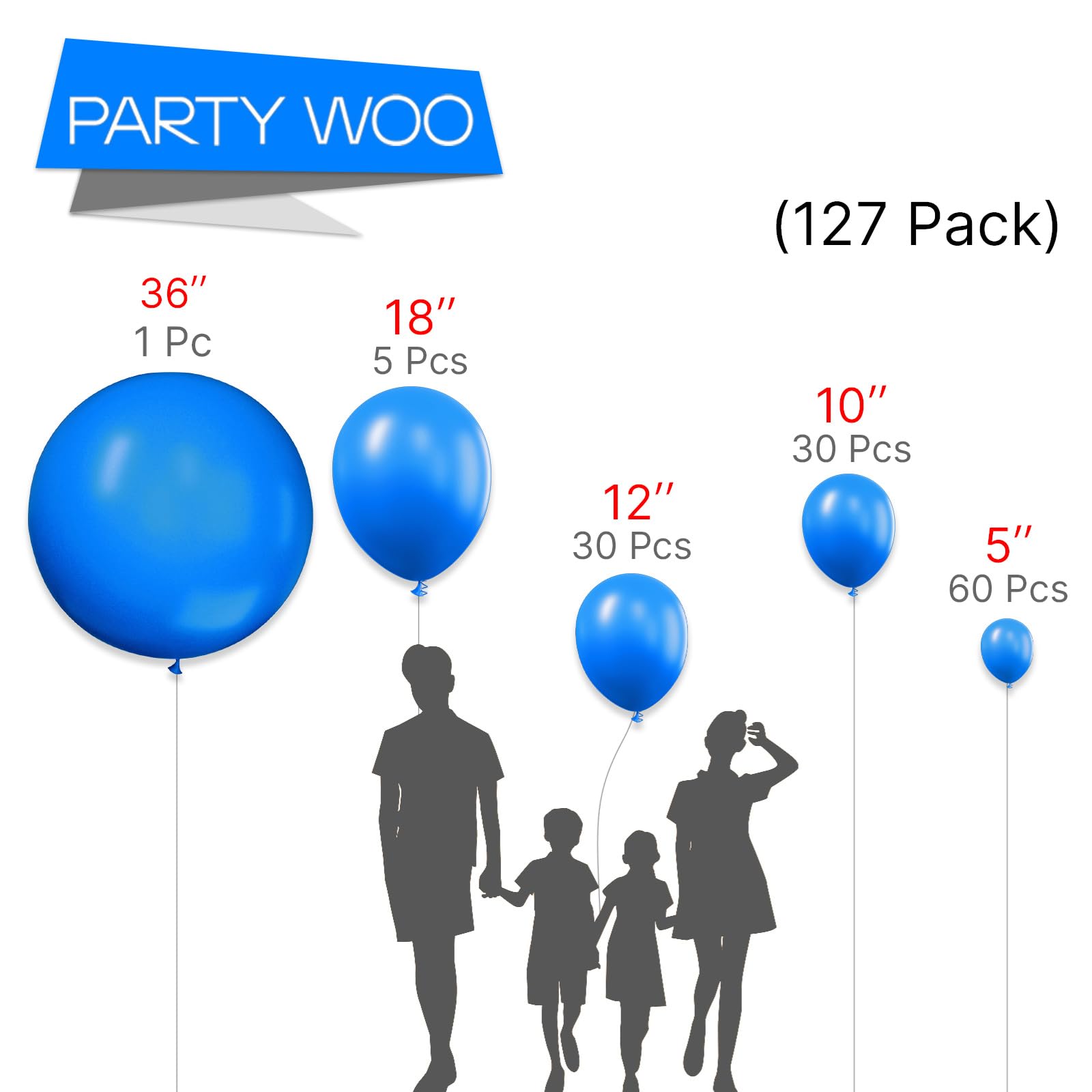 - 127 PCS ROYAL BLUE BALLOONS DIFFERENT SIZES: Package includes 36 inch balloons (1 pc), 18 inch balloons (5 pcs), 12 inch balloons (30 pcs), 10 inch balloons (30 pcs), 5 inch balloons (60 pcs)