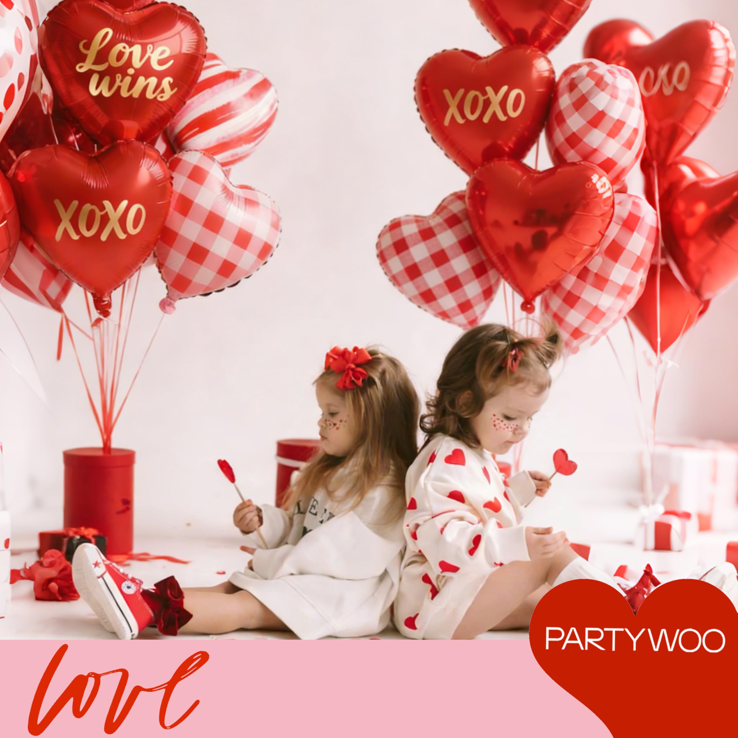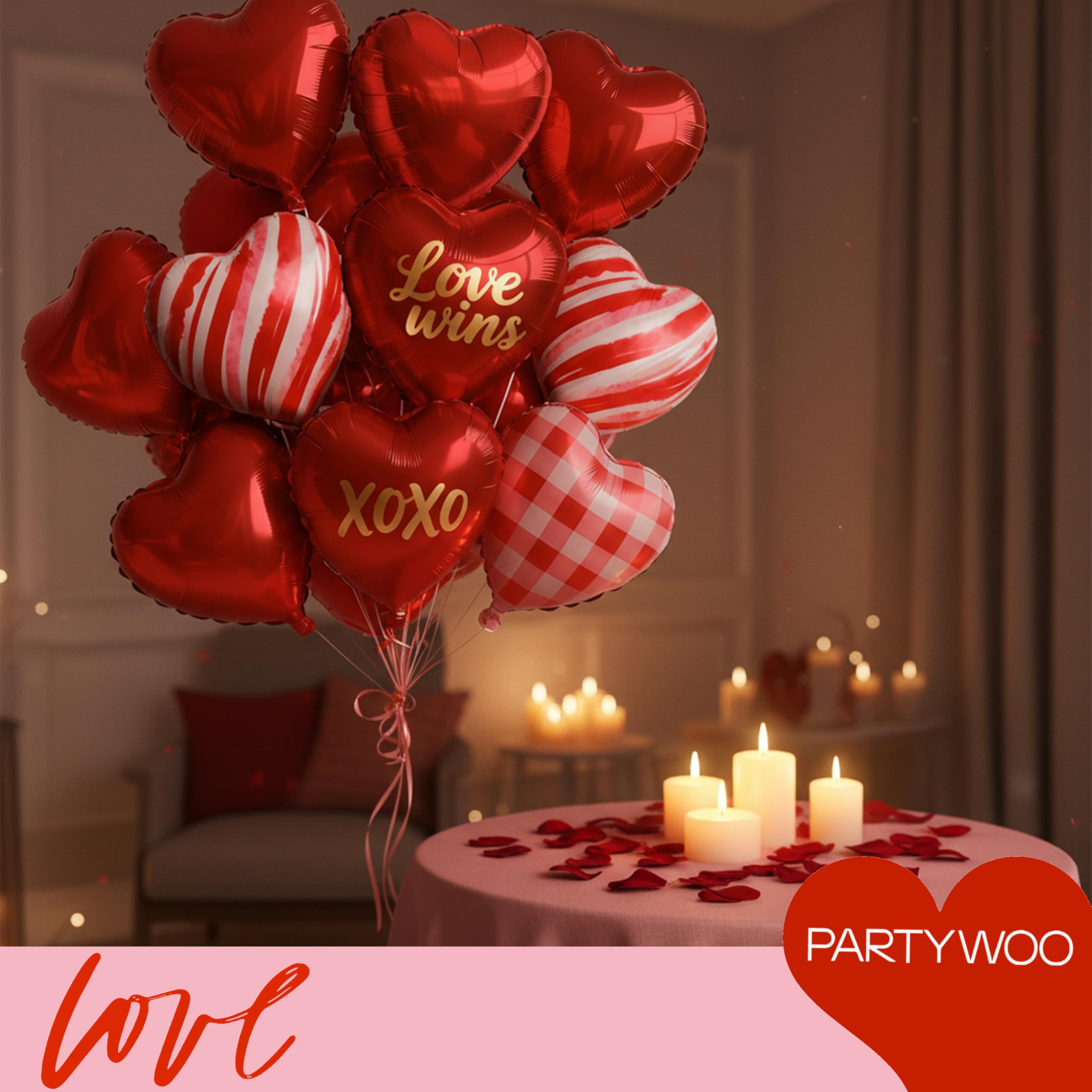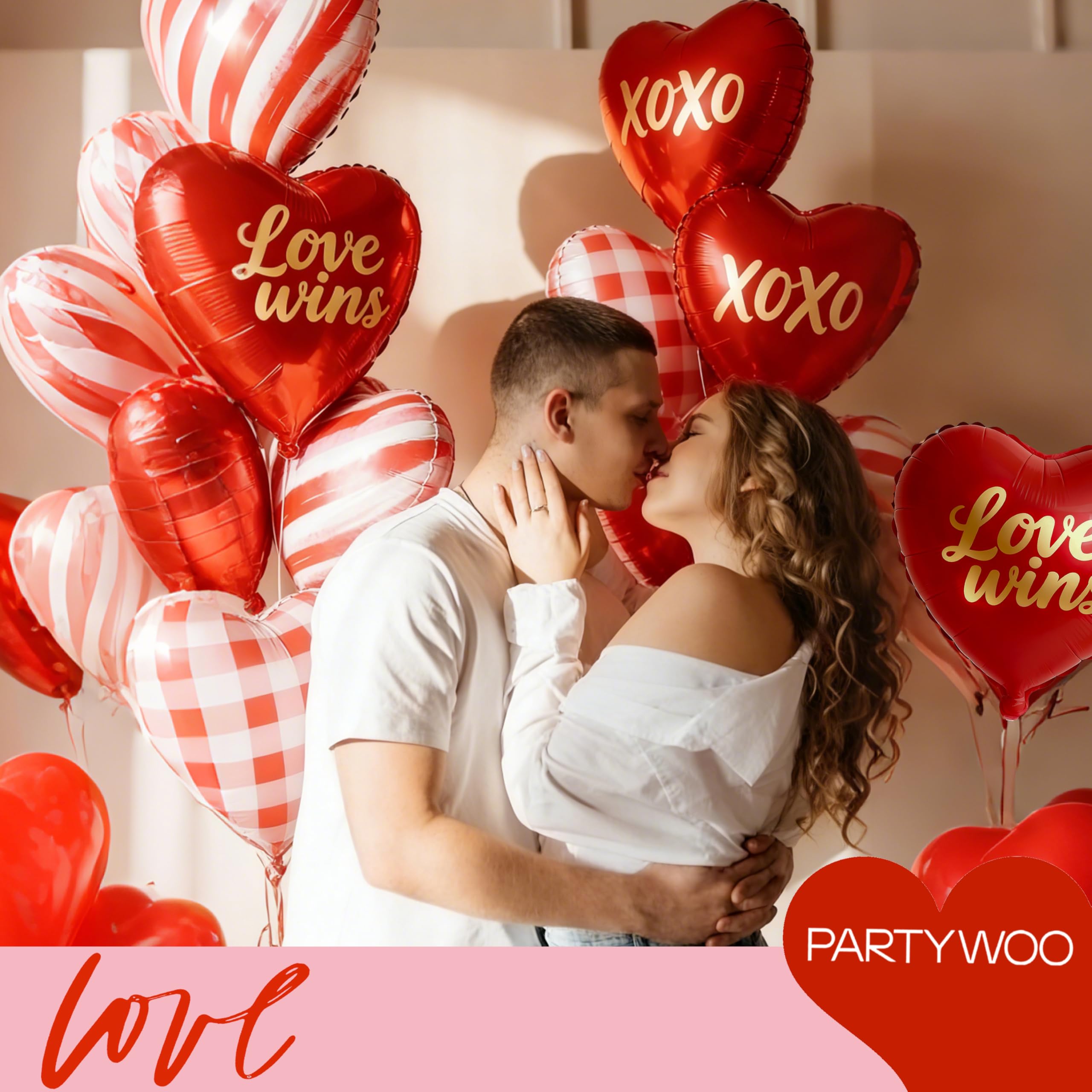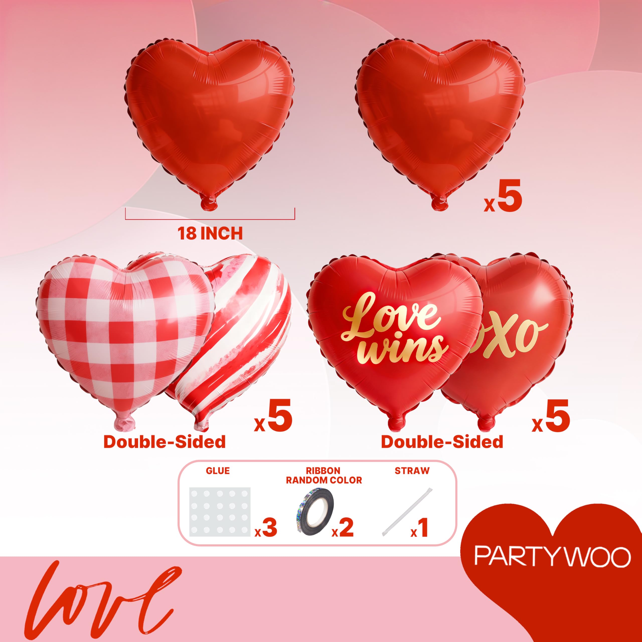PartyWoo Valentine's Balloons 15pcs 18 Inch Foil Love XOXO Red Heart Balloons Set for Romantic Valentine's Day Galentine's Day Wedding Anniversary Engagement Bridal Shower Proposal Party Decorations