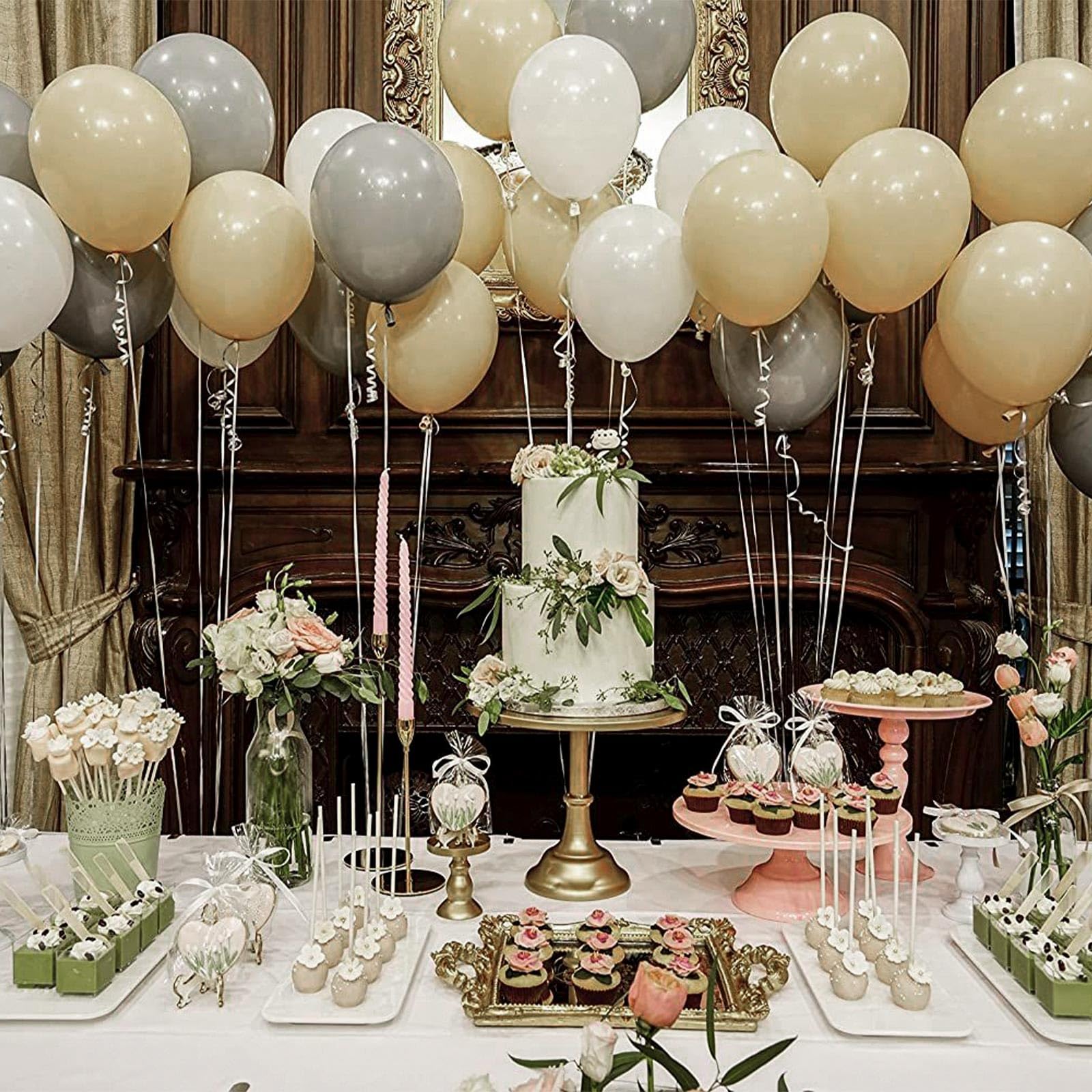 - What To Fill With: These beige balloons filled with AIR will stay full for up to 72 hours, and have standard balloon necks, allowing quick inflation. These beige balloons can bringing joy to your birthday party, wedding, baby shower decorations.