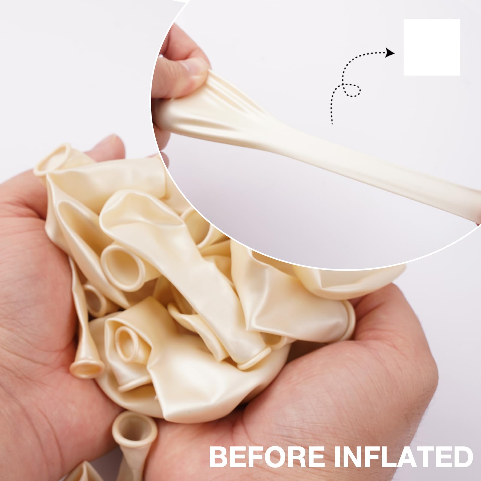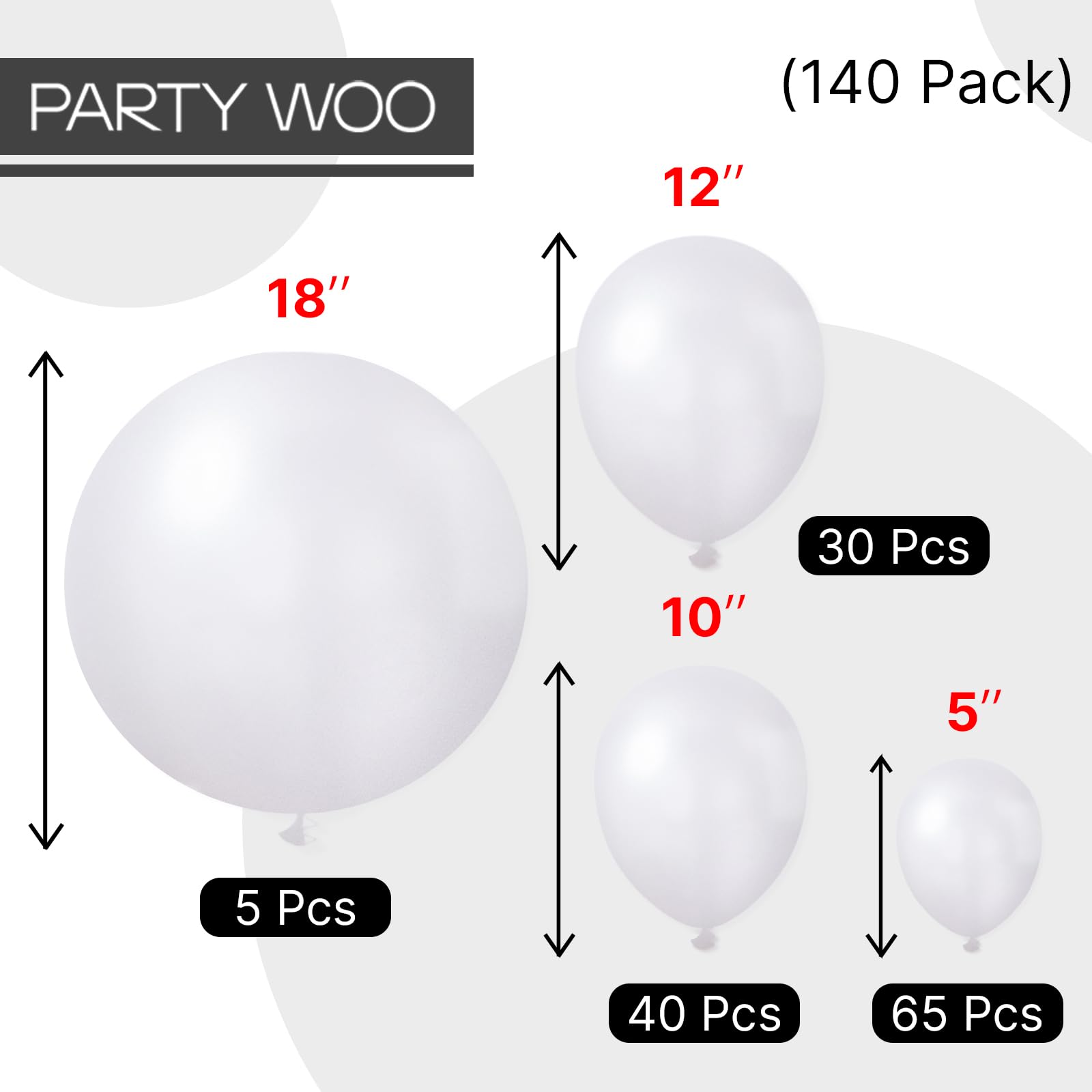 - Package includes: 18 inch pearl white balloons (5pcs), 12 inch pearl white balloons (30pcs), 10 inch pearl white balloons (40pcs), 5 inch pearl white balloons (65pcs), pay attentions that the 5 inch balloons could NOT float when inflated with HELIUM.