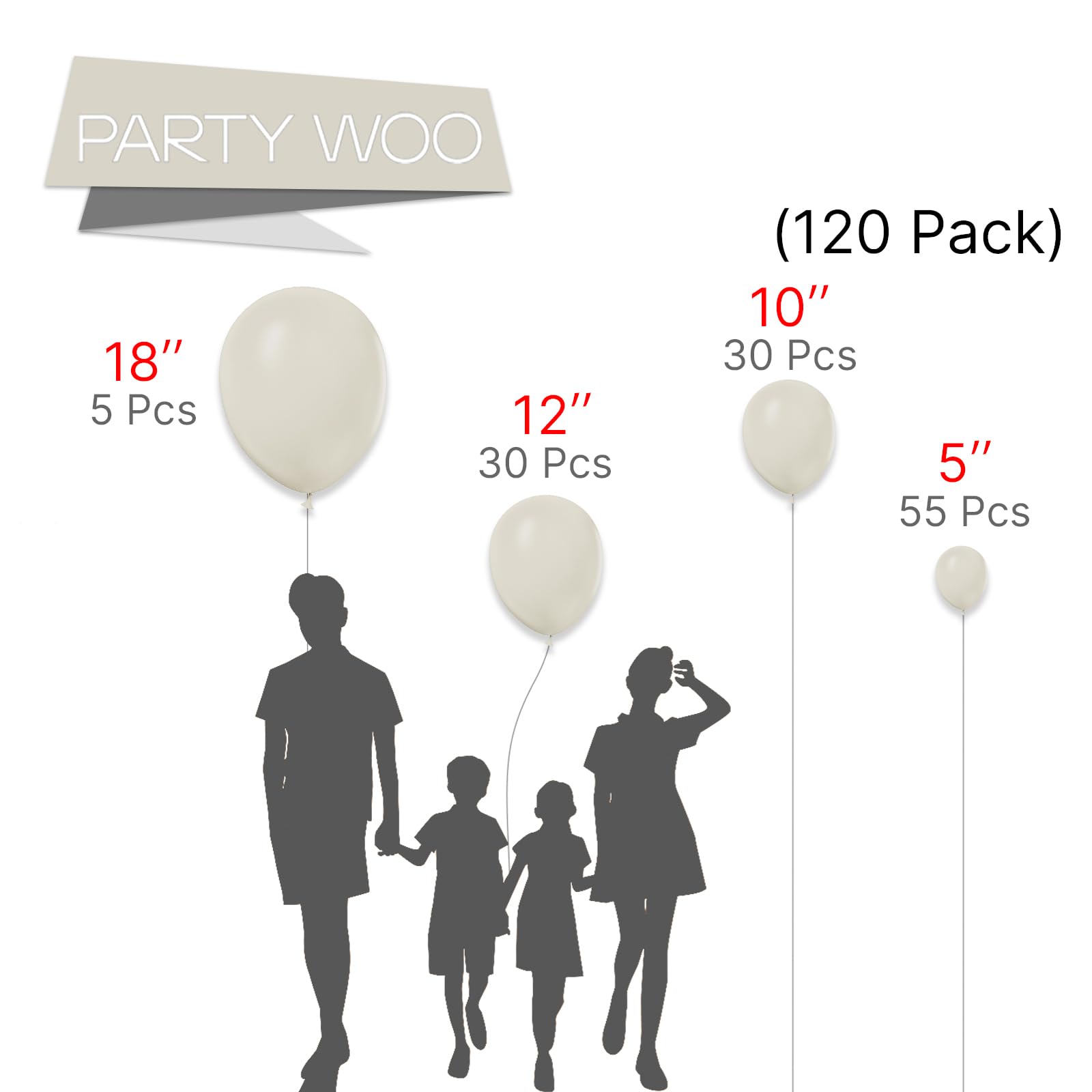 - 120 PCS WHITE SAND BALLOONS DIFFERENT SIZES: Package includes 18 inch balloons (5 pcs), 12 inch balloons (30 pcs), 10 inch balloons (30 pcs), 5 inch balloons (55 pcs)
