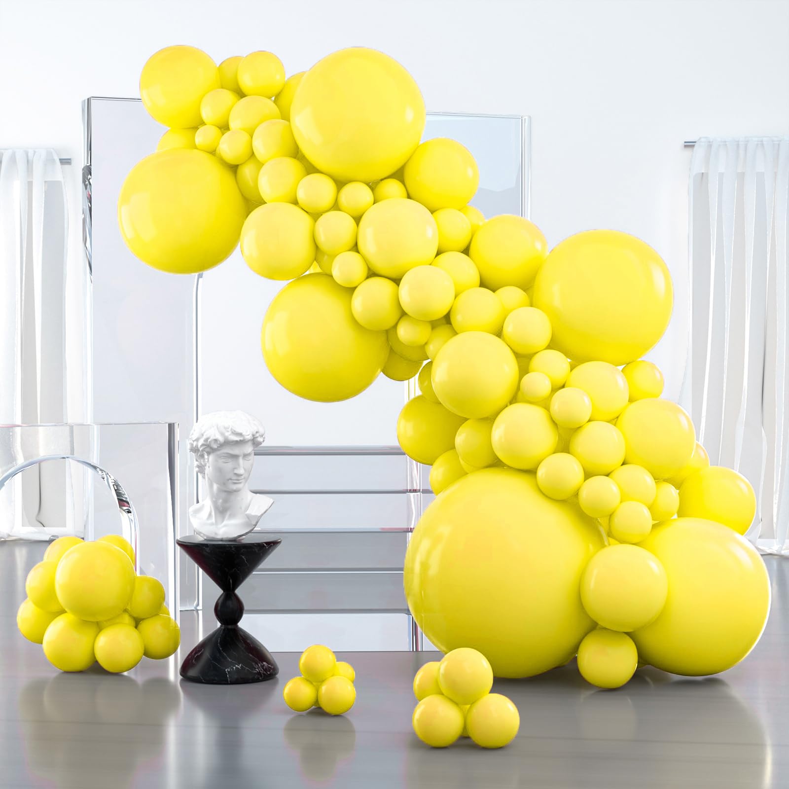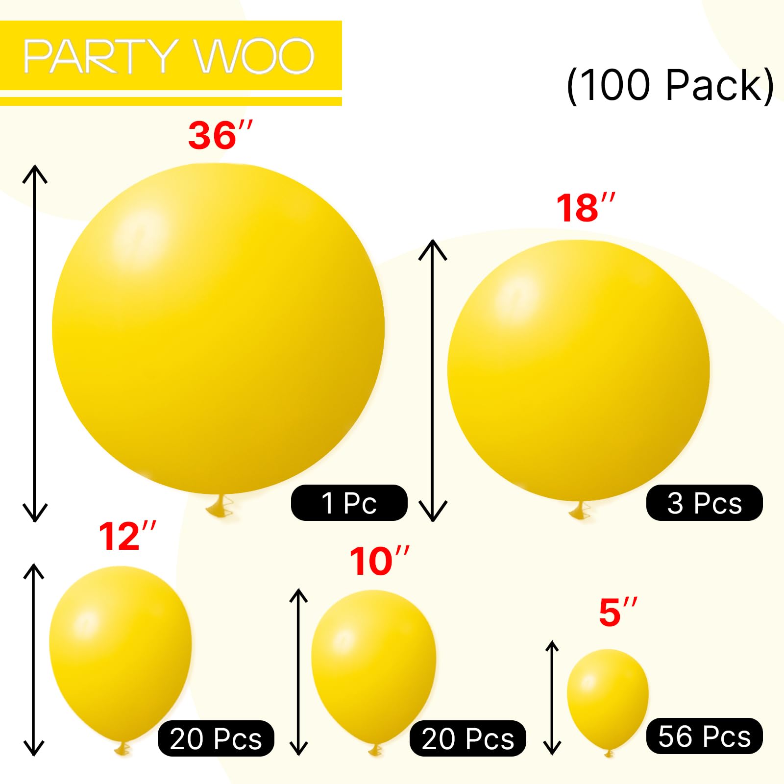 • 100 PCS YELLOW BALLOONS DIFFERENT SIZES: Package includes 36 inch balloon (1 pc), 18 inch balloons (3 pcs), 12 inch balloons (20 pcs), 10 inch balloons (20 pcs), 5 inch balloons (56 pcs)