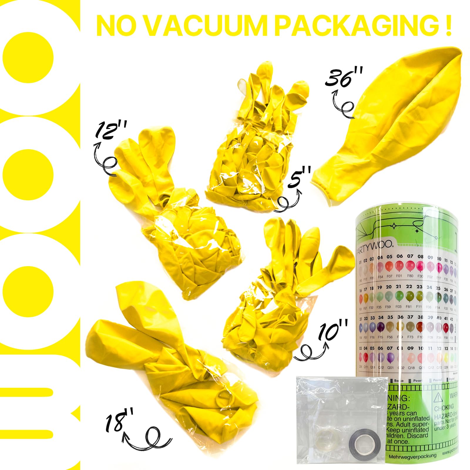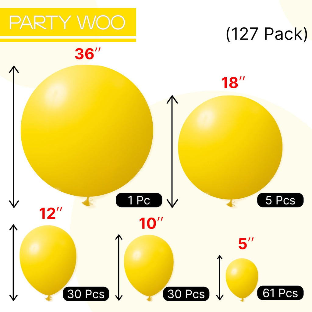 - Package includes: 36 inch yellow balloons (1pcs), 18 inch yellow balloons (5pcs), 12 inch yellow balloons (30pcs), 10 inch yellow balloons (30pcs), 5 inch yellow balloons (61pcs), pay attention 5 inch balloons could NOT float when inflated with HELIUM.